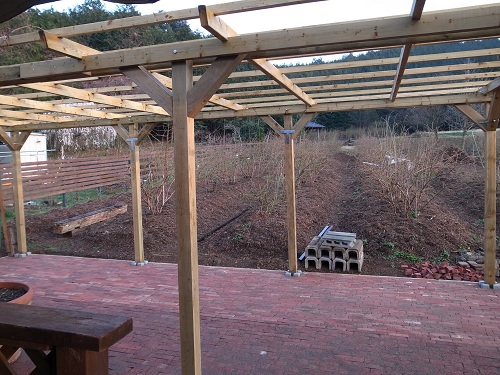 そんな中、1月から作り始めたパーゴラ(ぶどう棚)が最近になってようやく完成しました!